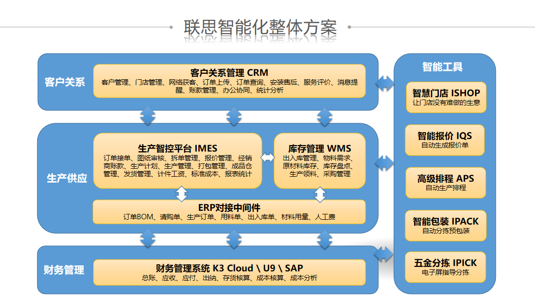 佳居乐家居在充分对比和了解过联思工厂管理软件的行业口碑和技术研发实力后,认为已有家具管理系统12年经验的联思,在家具整体化方案和行业影响力上,优势更为明显;最终选定客户关系管理CRM和生产智控平台MES为首次合作模块。